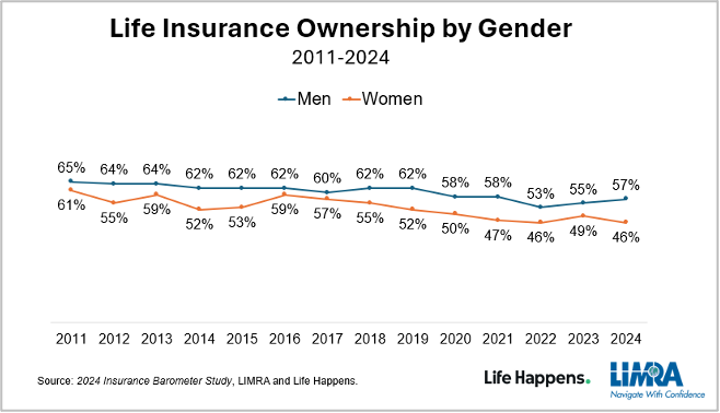 Gender Disparities in Coverage: There's a notable difference in life insurance ownership between men and women. In 2024, 46% of women reported having life insurance compared to 57% of men. This 11-point gap is the largest observed in the study's 14-year history. Additionally, 45% of women, representing 54 million individuals, acknowledge a coverage gap, and 36% plan to address this need within the year.